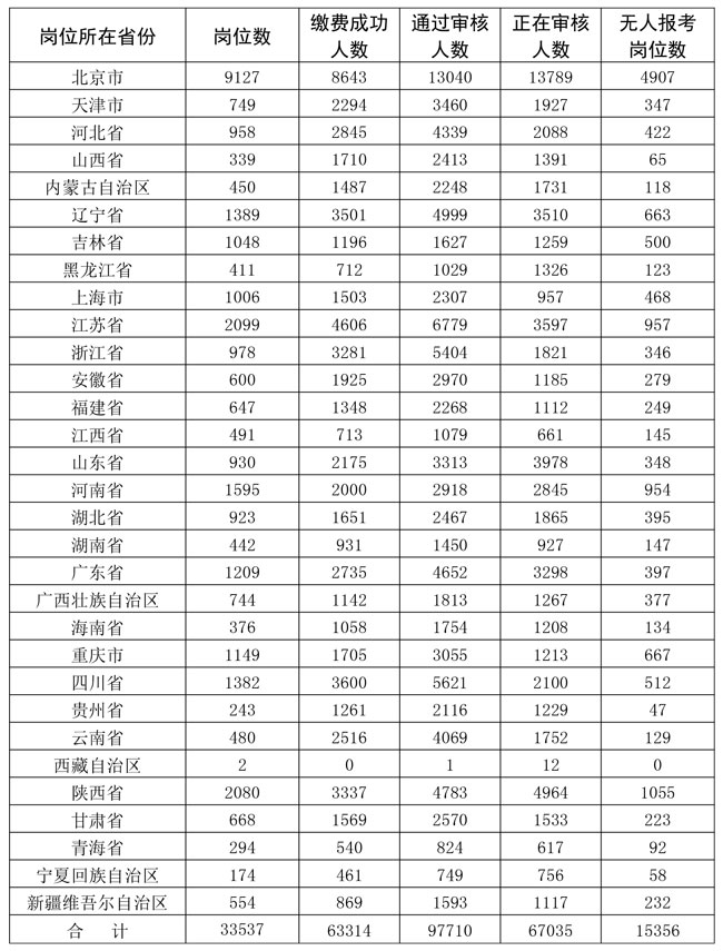 2023年军队文职人员公开招考网上报名火热进行中。截至1月15日17时,通过网上报名资格条件初审的报考人员97710名,缴费成功的报考人员63314名,正在审核报名资格条件的报考人员67035名。有报考人员完成缴费的岗位12783个、占38.12%,平均报招考比为4.95∶1,最高报招考比为335∶1。此次招考网上报名时间还剩2天,请广大报考人员抓紧时间申请报名资格条件初审,并及时关注审核结果,通过报名资格条件初审的请及时缴费和选择考试城市。相关招考岗位报考情况如下: