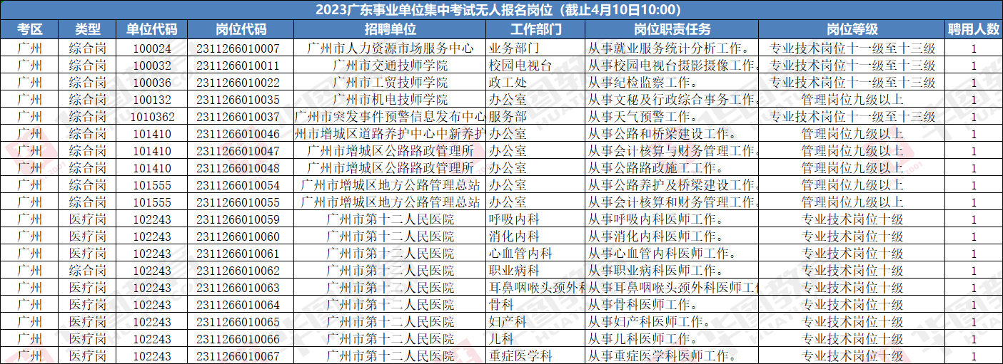 | 2023广东事业单位集中考试报名人数前十的岗位(截止4月10日10:00) | ||||||||||